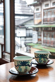 入口脇に設けた、宿泊者専用の休憩スペース「山ぼうし」。旅の始まりに、あるいは湯上りのひとときに。お茶を片手に、川のせせらぎで贅沢な時間をお過ごしください。